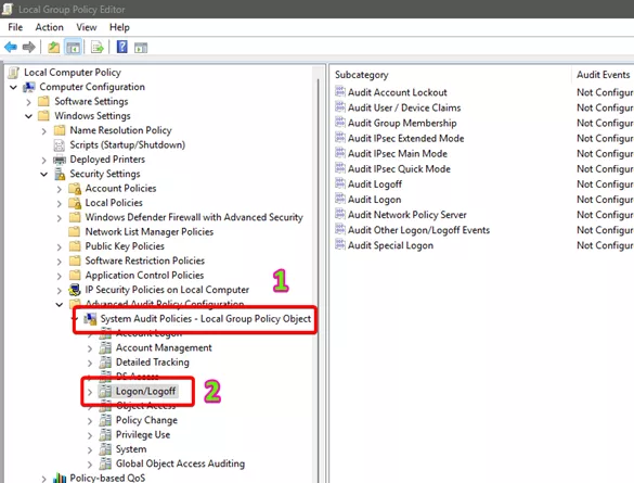 - Go to System Audit Policies – Local Group Policy Object. Click Logon/Logoff.