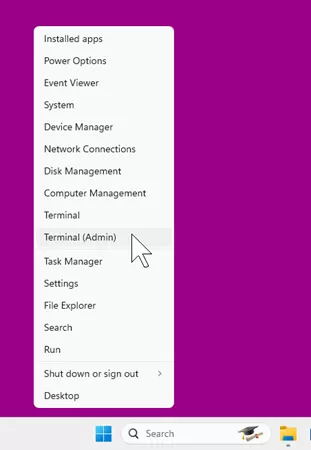 4. Run PowerShell as administrator. For that, just right click on Start and run Terminal(Admin).