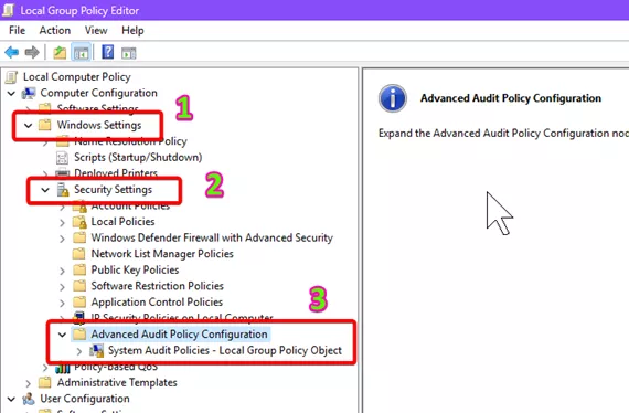 - Go to Windows Settings > Security Settings > Advanced Audit Policy Configuration. Expand this advanced audit policy configuration.