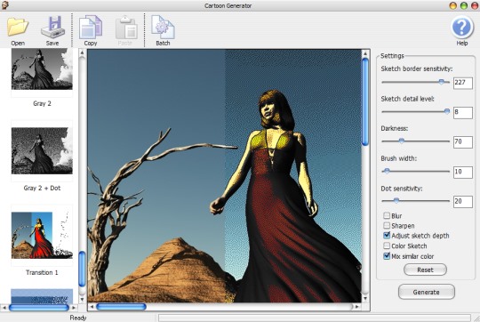 Cartoon Generator is a free cartoon maker that is used to generate a beautiful cartoons from a photo using 19 different effects. With each effect, you can adjust settings such as increase/decrease sketch detail level, sketch border sensitivity, dot sensitivity etc. to give a beautiful touch to your photo.