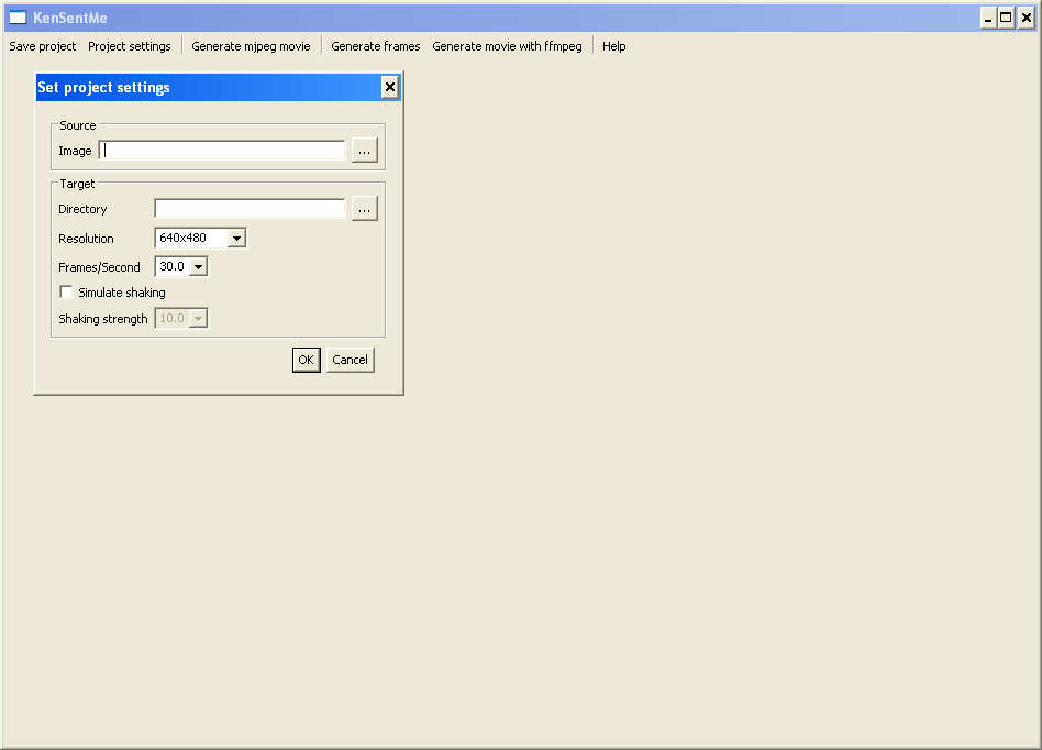After you start this free video from photo creator it will ask you weather you would like to open up an existing project, if you select no here, the application will offer you the Set new project window which can be seen on the image above. Source would be the image which you are recording, and it’s best that this image is bigger so that the quality of the video is better.