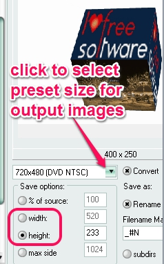 - You can select the output images size, if you want to resize added photos. There are multiple preset sizes available which you can choose from or can customize the height & width for output images.
