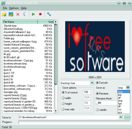 Altarsoft Photo Resizer is a simple software that allows to batch resize photos and lets you convert photos to bmp, jpg, tga, gif, png, tiff, ico, and in pcx image format. Thus unlike its name, it can convert photos as well. On its user-friendly interface, you will be able to preview images before resizing or converting them. Moreover, it also lets you rename all added photos with numbers, name, date, or height & width. Thus, it’s a multipurpose utility using which you can resize images in batch, convert photos into any supported output format, and can rename them quickly.