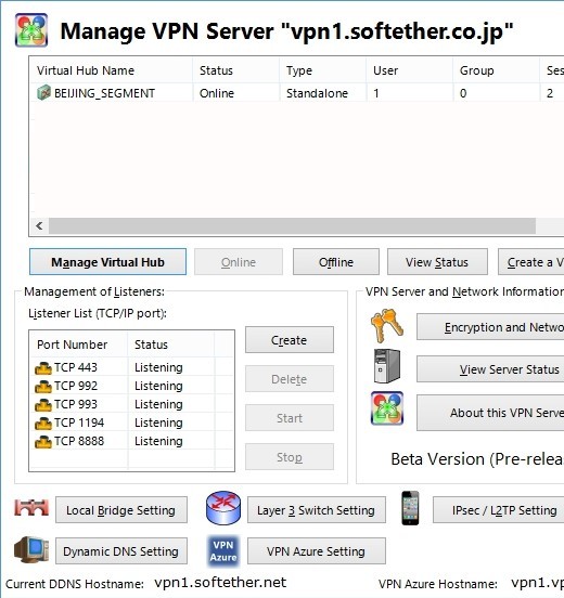 This is the SoftEther Server control panel, where you can configure and manage various different VPN server settings. Top left corner of the screen will show you a list of all the active servers that are under your control. Various other tools are available here, list of connections can be viewed, server status also. Key features of SoftEther VPN – free VPN software are: