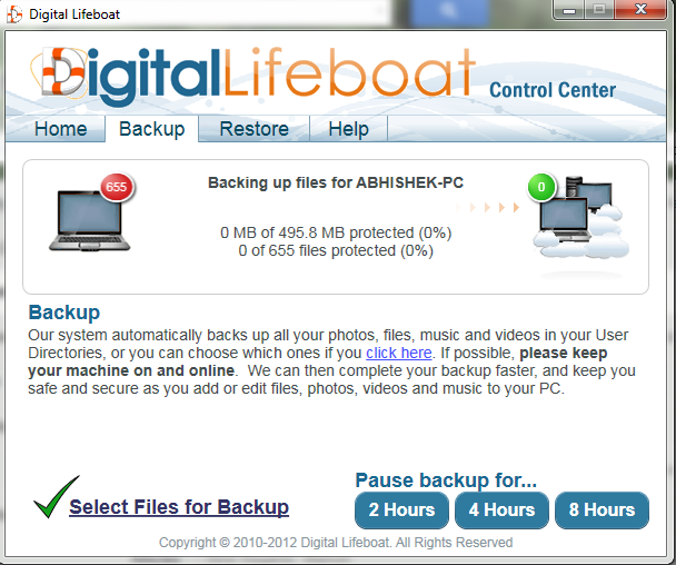 After digital lifeboat is installed in your computer you don’t need to make any changes in the settings as it automatically configures itself. Before you start using it you need to add the pc that you would like to be included in its backup process. It starts with the backup process and continues with it until you pause it. You have the option to pause the backup process to 2 hours, 4 hours or 8 hours. On the main screen of this free online file backup software, you can find the My Account option, you can click on this option and access your account on the website of the software. Whenever something new is loaded in the computer the software automatically creates a backup for it.