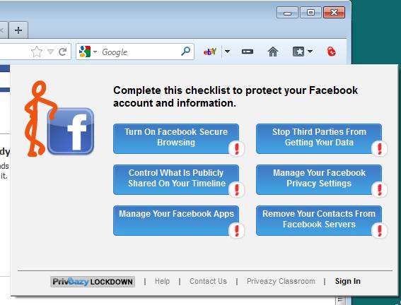 Image above is the interface of Priveazy Lockdown for Facebook. This free online security advisor add-on will install itself as a toolbar button which will only become available when you are on one of the supported websites. Depending on what kind of settings you have, you’re either gonna see warnings that there are some settings that you can change, or you’re gonna see a positive report that everything is properly configured and that you are safe.
