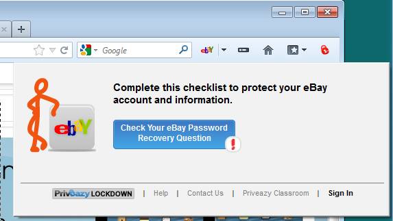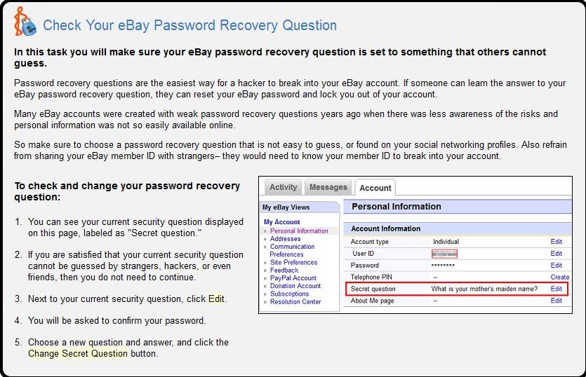 It’s very similar to what you can see in the first image above, only here now we have advice on how to improve the security and safety of our eBay account. Only one thing is wrong, we have to do a check up on the password recovery question. By clicking on the blue rectangle which you can seen in the image above, you’ll be brought directly to the settings of the web service that’s being visited, so that you can change the important setting right away and increase your security and safety online.
