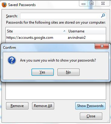 - As you click on “Show Passwords” button, a confirmation pop-up window comes up asking you to confirm that you want to see your passwords.