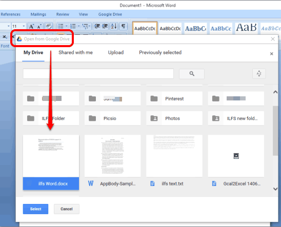 Above you can see the window using which you will be able to import an MS Office document from your connected Google Drive account.