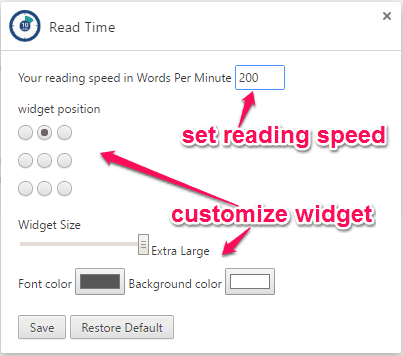Read Time is a free Chrome extension to find estimated read time of web pages. Using this extension, you’ll be able to easily find out that how much time a web page (such as an article, blog, book, etc.) would take for you to read. As per the developers, it uses the Firefox readability library for calculating the read time faster. To find out the read time of any web page, all you got to do is install this extension and it will automatically calculate the time, and displays it in a small widget. The time widget is completely customizable, as you can change the alignment, size, color, etc.