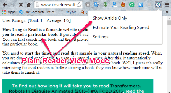One of the best features of this extension is that it apart from finding estimated read time, it also helps you toggle plain reader view mode for better readability, as it disables all the unnecessary CSS elements, ads, etc. from the web page.