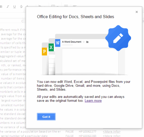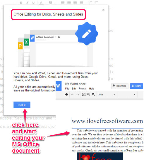 Office Editing for Docs, Sheets & Slides (by Google) is a free Chrome extension which runs offline. It helps to edit MS Word, Excel, and PowerPoint files with the help of appropriate App you find in Google Drive (like Google Docs for Word, Google Sheets for Excel, and Google Slides for PPT files). Now you might be wondering that Google Drive already supports the feature of editing MS Office files, then what’s the use of this Chrome plugin?