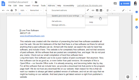 Speakd is easy to use. As you can see in the above image, I opened a Google document. The interface of this add-on appears on the right. Thereafter, you can select the text you want to be read out loud and hit the play button. If you do not select any text, the add-on will start reading the text in the document from the beginning to the end.