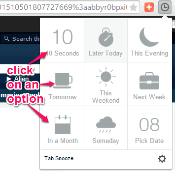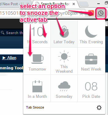 It provides multiple options to snooze a tab and automatically launch that particular tab in a new window. All options are available in a popup window. See the screenshot below. However, you can’t set a particular date and time to auto launch a tab. Although ‘Pick Date’ option is visible with other options, but it is not implemented yet. Still, there are many other options available to use. For example, you can use hide a tab to automatically launch in 10 seconds, Later Today in 3 hours, 10 hours, 5 hours, some other day in 1 month, 3 months, etc.