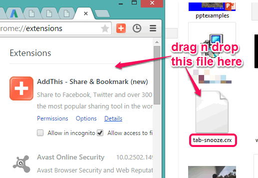 After downloading its crx file, open your Google Chrome browser and go to Extensions manager. Drop its crx file on Extensions manager page to install this extension. The same thing you need to do to install this extension on Opera browser.