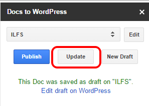 After submitting a document to WordPress, a new button, Update, also appears. When you have made changes to a document in Google Docs, you can use Update button to apply the changes to published document in WordPress automatically.