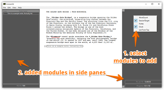 Step 3: Although ImmersED is as minimal as it can get, you can customize it quite a bit by adding some useful modules, like clock, word counter, and more. To add a module, right click anywhere in the blank space on either side of the text editor, and select the module you want. Here’s a screenshot: