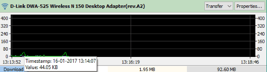 To see the data usage graph of a network adapter, select Transfer option from the drop-down list that appears next to the network adapter name. After that, you can see the data usage graph of that network adapter. The best part is that you can easily get to know the amount of data used in a particular time period. For that, hover your mouse over the data usage graph and click on a point on the graph. It will then display the timestamp and the amount of data used through that network adapter at that point in time. You can follow the same procedure to know the speed of a network adapter in a point of time.
