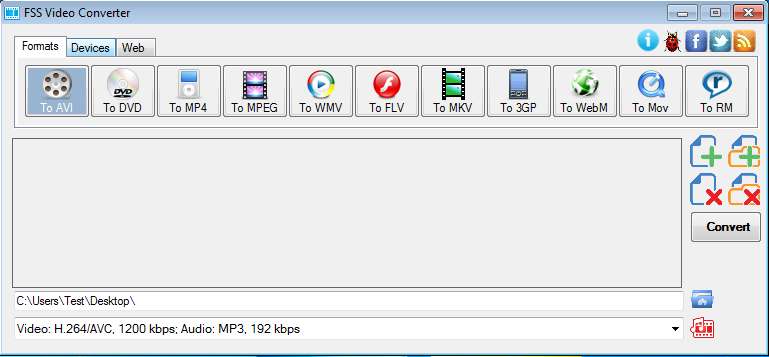 Screenshot above show us the interface of FSS Video Converter. All the way to the top left corner there are three tabs which you can use for switching between presets, like we said, common formats, devices, and the web. Below that, buttons are available for quickly selecting the format that you want to use during video conversion. Empty area in the middle of the window is where videos that you decide to convert are gonna be listed. At the bottom you can select the output directory, and also manually adjust both audio and video codec settings. On the right buttons for adding and removing videos to the list can be seen, and last but not least we have the Convert button.
