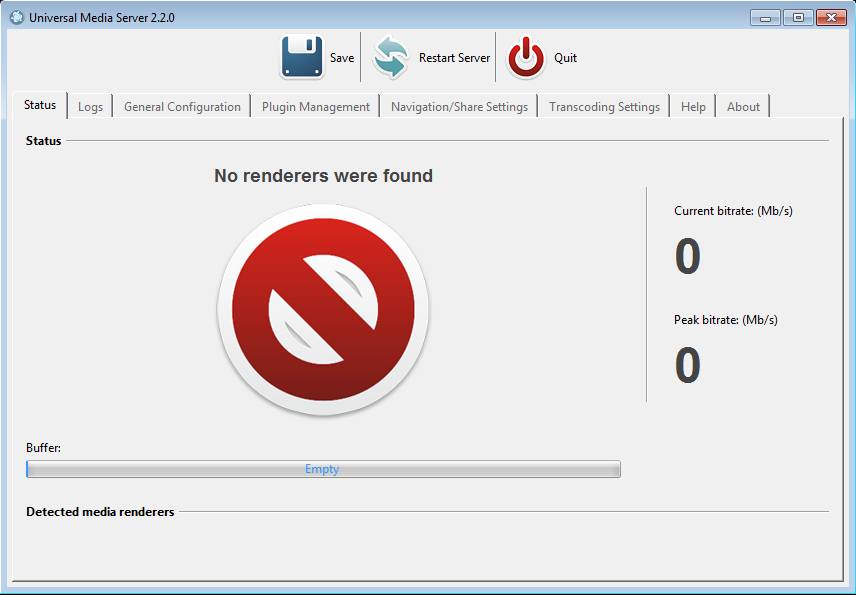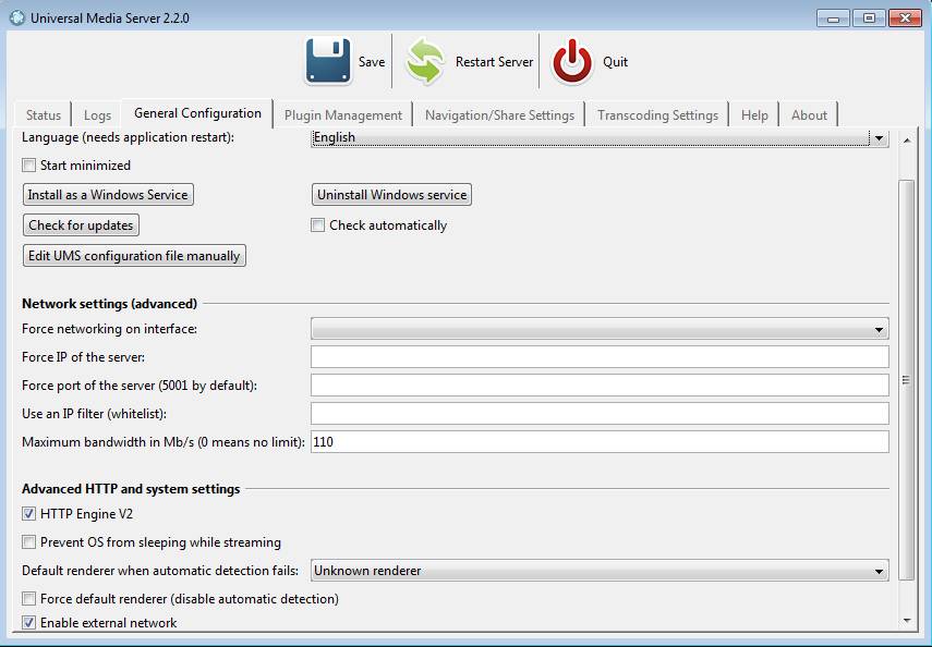 This is where you actually configure network and HTTP settings of your media streaming server. At the top, you can also select how exactly you want Universal Media Server to run, when it’s started with the system. Transcoding Settings tab also hold important settings of the encoders that are supported. When you’re done setting up everything, click Restart above to apply settings, check the Logs tab and if everything is OK, your media streaming server should be up and running.