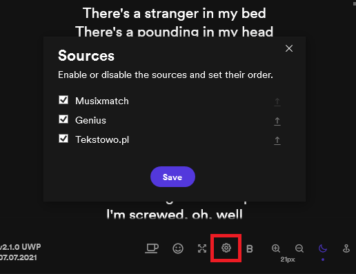 The lyrics viewer of the tool has some customization options as well. If you want, then you can turn off some lyrics sources because by default, it uses all of them. If you want it to fetch lyrics from a single source, then you can just configure that in the settings. Click on the gear icon from the bottom and turn off the desired lyrics sources.