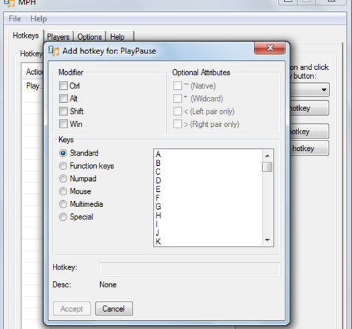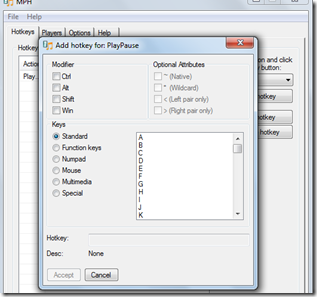After you open the software a small window pops up where you are presented with numerous options on the right and at the top. In order for you to start using the software you need to highlight the Hotkeys tab, then select the media player action from the dropdown list present on the right. After this click on the Add Hotkey and to add the key as per your requirements. While you set up a hotkey just make sure that the other program doesn’t require it and click on accept to complete the set up. You need to repeat the steps 2-3 until you have completed setting all the hotkeys.