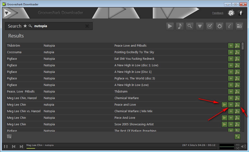 Depending on what kind of internet connection you have, search might take a bit longer, but when it’s done, you should see something very similar to what you can see on the image above. Songs should have three icons next to their name, like the one pointed with red arrows on the image above, but majority of them will only have two. The first one is obviously to play the song right away. It won’t be possible to play every song, it probably depends on the source of where the song was found. Second icon, the plus sign is to add songs to the download queue, and the third is to add song to the playlist.