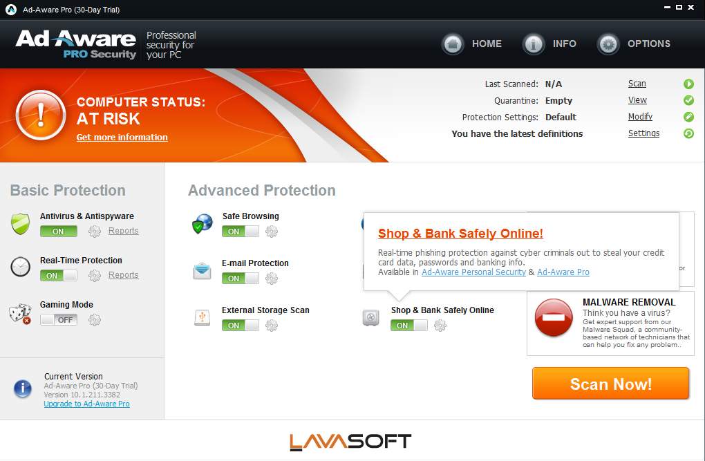 Looking at the image of the default window above you’ve probably noticed that what we get after installing the free version of the program is a 30 day trial of the Pro version. There are 2 different paid version of Ad-Aware Antivirus, Personal and Pro. They are paid monthly 1$ and 3$, respectively, and they get the following advanced options: