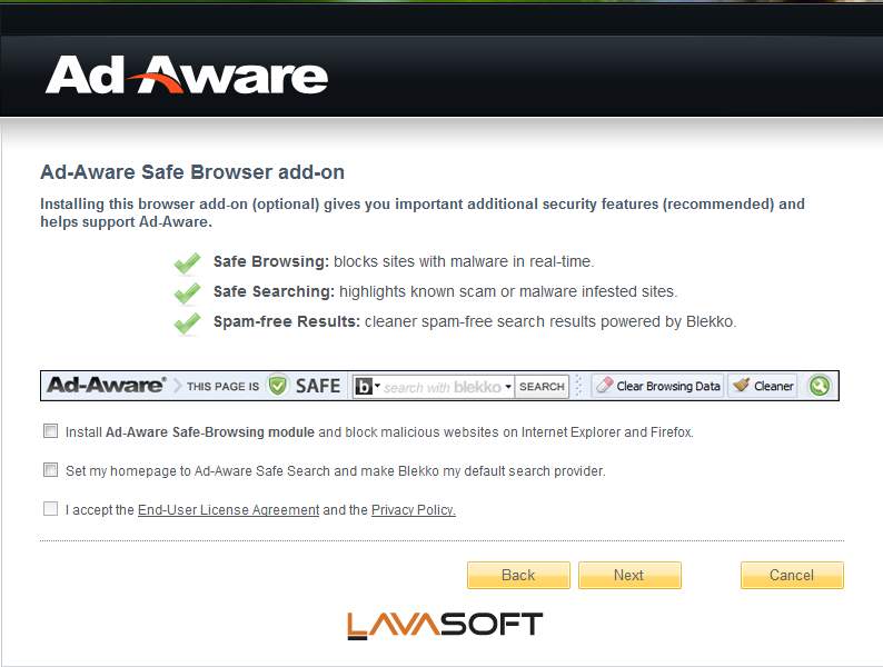 Ad-Aware Free Antivirus has a surprisingly small download size of only 10MB, which is great for all those who might not have access to broadband connections. Installation went fine, of course there was the usual promo step where we were offered to place Ad-Aware as our homepage and install toolbars, you know how it is, uncheck these options if you are not interested in them.