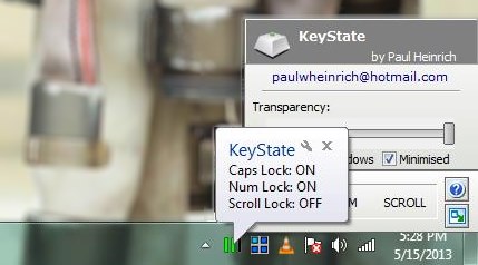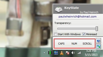 KeyState  is a nice free app to know whether the Caps Lock, Num Lock, and Scroll Lock keys are On or Off. It sits in your system tray area, constantly displaying the current status of these buttons and giving immediate balloon or sound notifications whenever the status of these keys changes. Download free and try it out now.