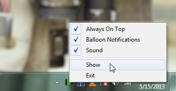 After you launch the app, it will integrate itself to the notification area of your system and keep siting there to display status notification every time you turn On or Off the Caps Lock, Num Lock, or Scroll Lock key. The tray icon of the app displays three vertical bars, each corresponds to one of the Lock key. The bar turns green when a particular button is “On”, and it turns black when it’s “Off”. The right click menu of the system tray icon gives you access to the app’s interface, and options to get sound alerts or balloon notifications.
