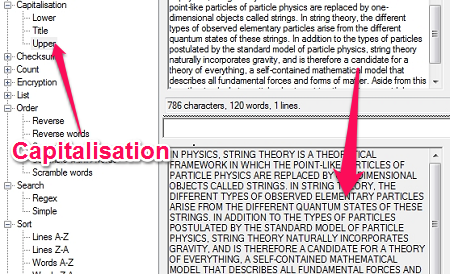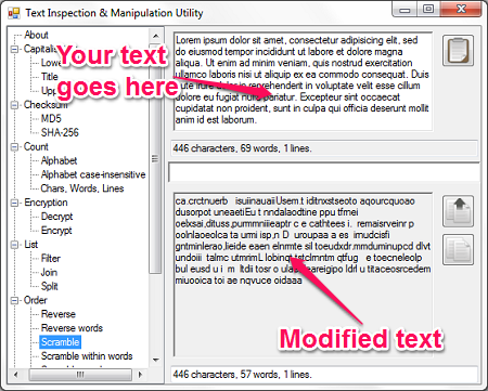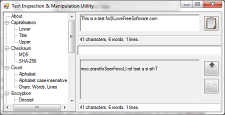 Text Inspection & Manipulation Utility is a text manipulation tool that lets you manipulate text, generate checksum for the text, encrypt/decrypt etc. Other text manipulation functions includes capitalisation, changing the order of the words, search within the text, sort the text in alphabetical order and convert the text to Leet.