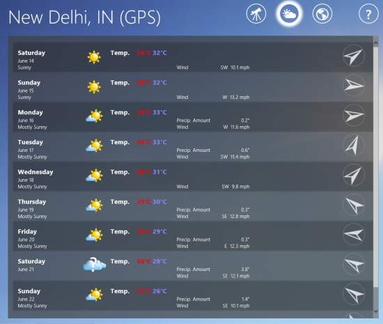 Elements Weather Forecast is a free Windows 8 weather app which shows the hourly forecasting of weather of the whole world and of upcoming 7 days as well. You can also check the sunrise, sunset, moon rise, moon set, and day length of 7 days of any city around the world. The app also uses you GPS location to show local weather forecasting. It also lets you chose the unit of temperature from Celsius and Fahrenheit.