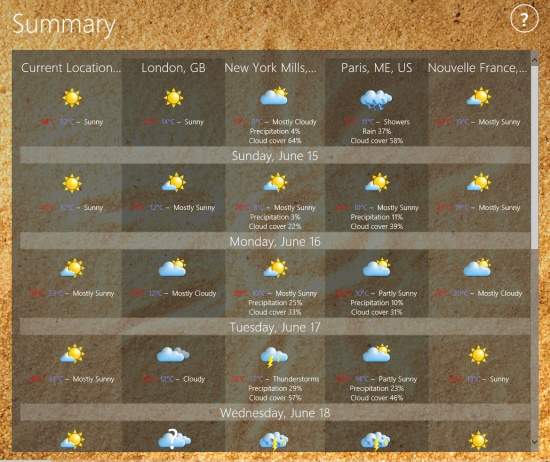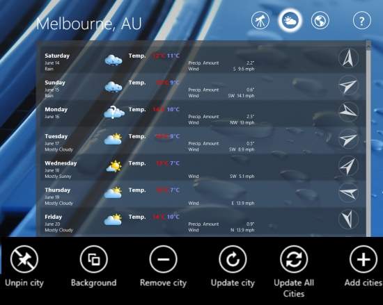 Elements Weather Forecast is one of the best weather apps for Windows 8. It shows the weather forecast of all the cities of the world. The best thing I like about this app is that it lets you individually pin different cities on the Windows 8 start screen. It shows real time weather and changes background accordingly. If you are looking for a weather app, then you should definitely try this app.