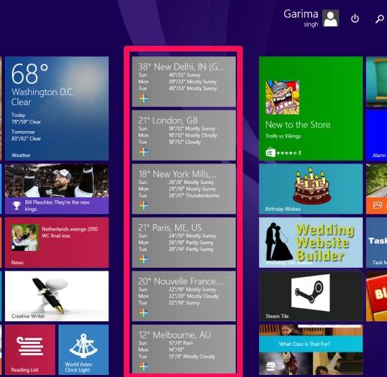 You can pin your city to the start screen of Widows 8 as well. To pin, right click anywhere on the screen. You will find different options: Pin, Background, Update, etc.