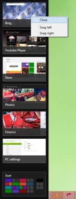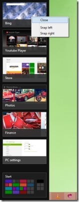 You can bring up the app switcher by moving your mouse pointer to the left corner in the upper part of the screen as shown above. The app switcher in Windows 8 shows you all the applications that are currently running in Windows 8. You can stop and close these apps by right-clicking on the app that you desire to close; a context menu will come up as shown in the screenshot above. Just click on the close option to close the app in Windows 8. You can also drag an app to close it; just pick it up and drag it down to close apps in Windows 8 task switcher. Also this context menu enables you to snap apps and do multitasking with these modern apps.
