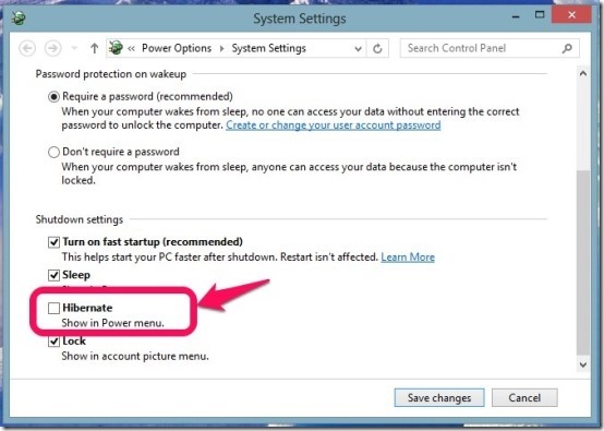 - Now all you need to do to enable hibernate in Windows 8 is to put a checkmark on the checkbox as pointed out in the screenshot above. After this just click on the Save changes button to enable hibernate in Windows 8. Now when you click on the settings button you will get the option to hibernate along with the other regular options as shown in the first screenshot of this post.