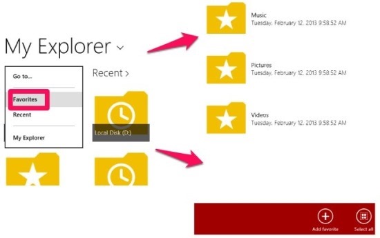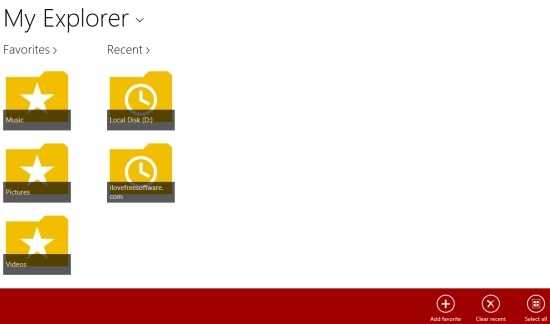 To add more folders to your favorites just click on the My Explorer which is written at the top on the app window and you will have a list as shown in the screenshot below. Just select favorites options and a new windows window will appear as shown in the screenshot. Just click on the Add Favorites button which is located on the lower right corner of the window. ![]()