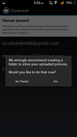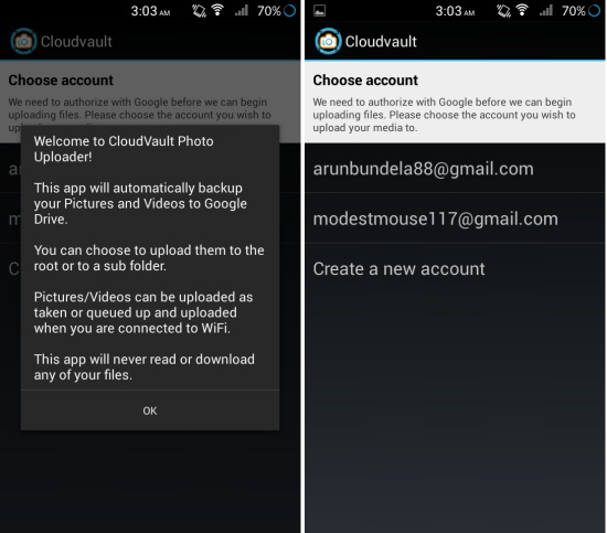 You can get CloudVault Photo Uploader for Android from the link or QR code at the end of this review. After installation, launch the app. You will have the welcome interface as seen below. Simply tap on the “OK” button to continue. Now you will need to choose the Google account to which you want to upload the photos. If you like, you can add a new account by tapping on the ‘create a new account’ option.