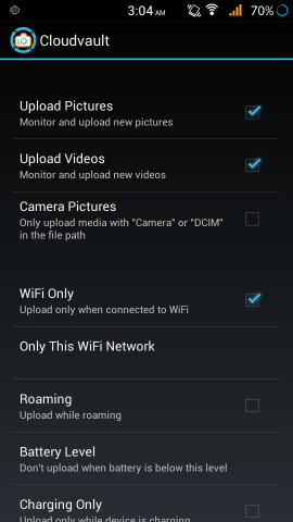 While in the main interface of the app, simply tap on the settings button and you will be brought to the settings as seen below. From here you can choose to upload picture, videos, or both. If you like you can turn on the “Camera pictures” option and only the photos taken by the camera will be uploaded. Also, CloudVault Photo Uploader allows you to manage the way it uses the data. You can select the options so that it only uploads while on Wi-Fi, uploads or does not upload while roaming, does not upload when the battery is below a set level, and more.