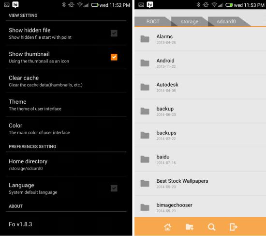 In the preferences of Fo File Manager, you will find options like showing hidden files, showing thumbnails, clearing cache, setting the home directory and language. Also this free file manager allows you to customize the look by changing the color and theme. Below you can see that by changing the color to light and choose Orange color, I managed to change and personalize the look of Fo File Manager for Android.