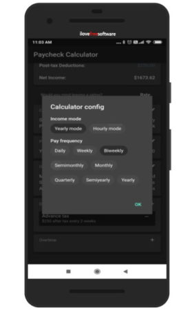 This is the home screen of the app, with some default values shown in the columns. These values can be edited easily. Click on the pencil icon or edit icon given next to some of the boxes. This will open a modification window, where you can change the values. Like in the screenshot below, you can change the frequency of the paycheck that you receive and income calculation can be changed between yearly mode or hourly mode.