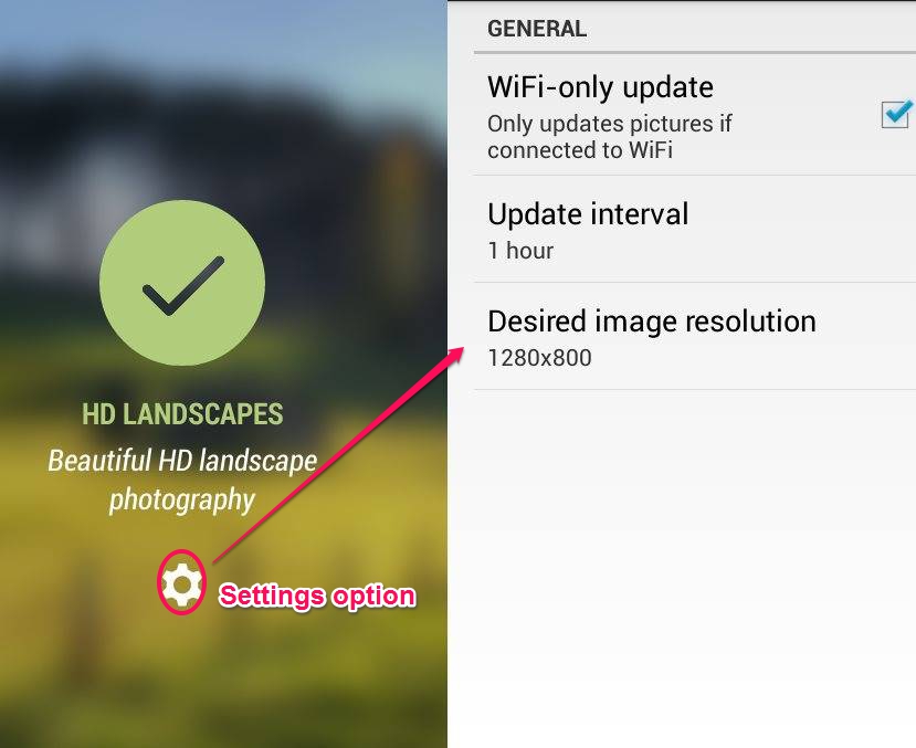 As this app is just a plugin to Muzei-live wallpaper, so you won’t find any separate icon for this app on your phone. Just open the Muzei-live wallpaper app on your phone and you will find the option that says HD Landscapes. Select that option to enable Muzei app to use HD wallpapers provided by this app. You can customize the resolution of the wallpaper, the time interval after which a new HD Wallpaper will be automatically downloaded on your app (time interval varies from 1 hour to 48 hours). You can also choose to download wallpapers only when you are connected to a Wifi network, and not on mobile data.