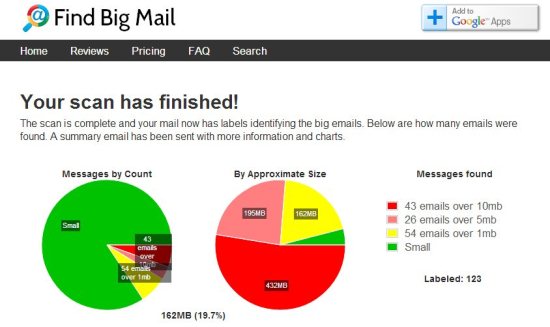 Find Big Mail is a free web-based application to find big emails in your Gmail account. It scans your Gmail account for bigger mails and sort out mails in 3 groups: over 1 MB, over 5 MB, and over 10 MB. Not only it finds big emails in your account, but also display results in pie-chart representation that helps in getting a clear view of the space consumed by each group.