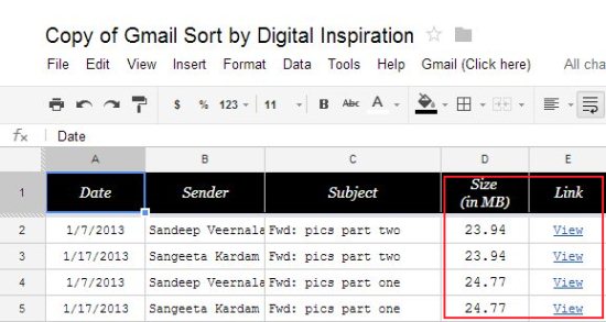 The basic idea is to connect Google Docs to your Gmail account and sort all the emails that are larger than a certain size (> 1MB). To follow the process, you need to add a copy of the spreadsheet to your Google Docs which contains the desired script for making connection to your Gmail account and scanning all your mails for size of attachments. You can refer the original labnol post here, to get the spreadsheet copy and step-by-step guidance on how to connect Google docs to your Gmail account to scan emails.