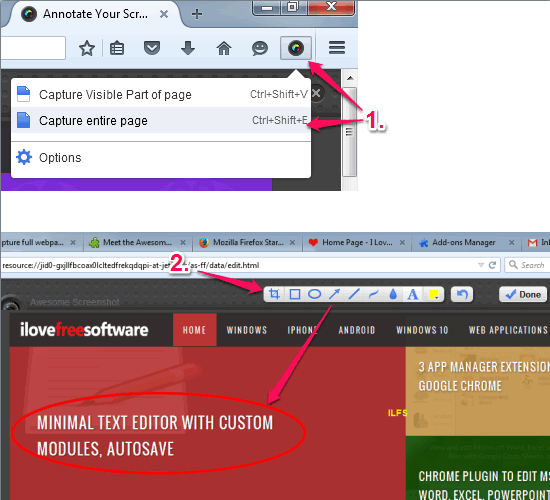 Easy Screenshot has all those options which you can expect in a good screen capture Firefox add-on. It supports hotkeys to capture visible content, whole page, and page region. You can also use its icon to capture the webpage. Capture webpage can also be annotated with various tools like rectangle, line, free hand drawing, text, and blur tools.