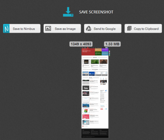 What makes it better than other add-ons available in this list is that it provides more saving options. For example, you can save the screenshot to PC (PNG or JPEG), your Google Drive account, and to your Nimbus account. If you have created a free account to Nimbus, then you can save screenshots in the cloud and can also comment on your screenshots.