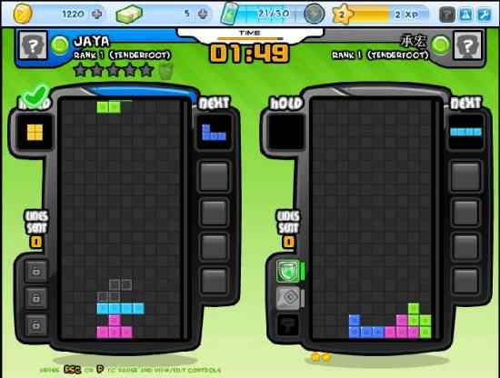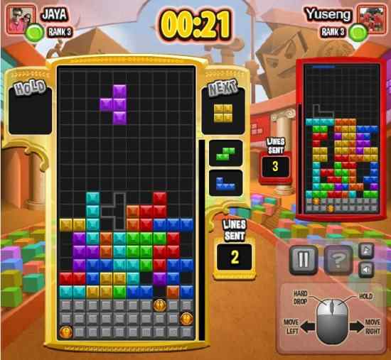 When the game is started you will see a screen like the one shown in the screenshot above. The left side playing area is yours and the right side playing area is that of your opponent. Click the start button to start the game. The Tetris blocks will start falling from the top of the screen and you have to place them at the bottom of the screen in such a way that the block make a full line. When the line is complete, it will disappear from the board. Both you and your opponent get 2 minutes of time to complete as many lines as you can. Whoever does that wins the game and both of you are awarded coins and stars as per your performance. You can also invite your friends to play this game with you.