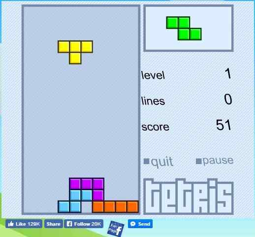 The score can be viewed on the right side of the screen. You can see the number of lines that you have completed so far, the level which you are at, and the current score you are at. At the top right side you will also be seeing the next block shape which will be falling down. You also have the options to quit or pause the game.