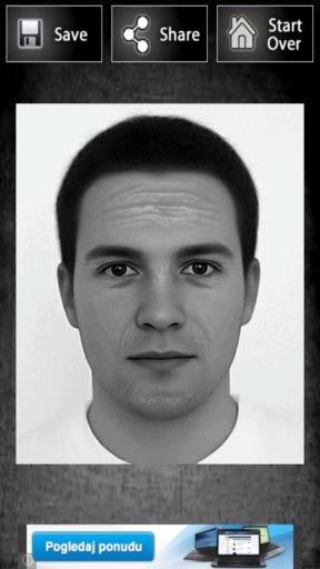 Before the conversion can take place, you need to again set up the face markers. This time only the eyes are important, first the left one then the right. After the markers are setup on the image, app will apply the conversion effect, which can be seen above. Notice that the effect isn’t that impressive as that of AgingBooth, in other words, not as many years are added.